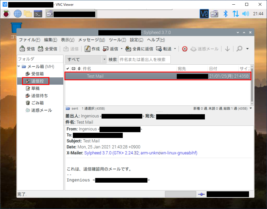 左側のペインの「送信控」をクリックし、右側のペインに送信したメールが表示されていれば、正常にメールの送信が完了しています。
