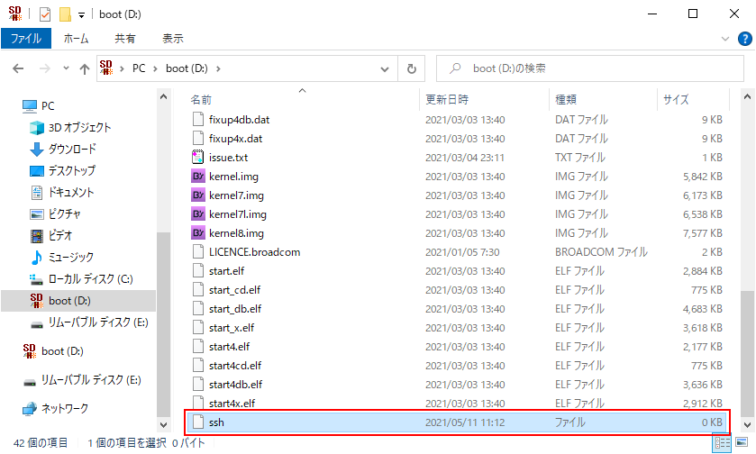 3.notepadなどのテキストエディタを使用して、「ssh」というファイル名の空のテキストファイルをmicroSDカードの「boot」ディレクトリ直下に作成します。
